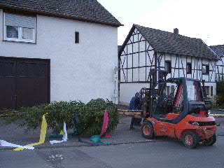 Der Maibaum wurde schon Tage vorher aus dem Wald ins Dorf gebracht. Nachdem der Stamm geschält wurde, trocknet der Baum noch in der Sonne. |