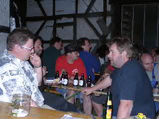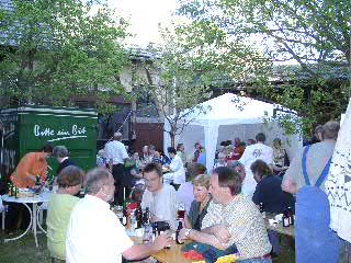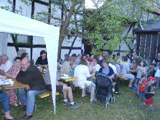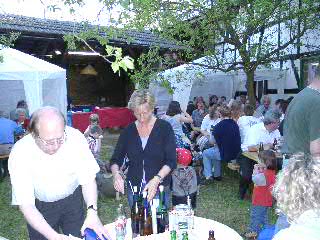 Im Innenhof versammeln sich die Ramerbacher und erfreuen sich bei warmem Wetter an Ahrrotwein, selbstgebackenem Brot und Spiessbraten.